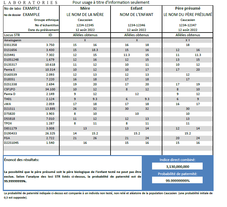 Le rapport final indique clairement si le père supposé est exclu ou non comme géniteur biologique :